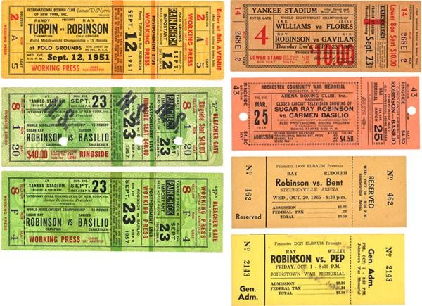 Sugar Ray Robinson fought as a professional fighter for twenty-five years. He established a record and legacy which has not been eclipsed to this day. When he retired he was given a trophy by Madison Square Garden which stated it all, “Sugar Ray Robinson The Greatest Fighter Who Ever Lived.” Presented here are seven official full tickets from various fights involving the great Sugar Ray Robinson. The tickets include: Robinson-Gavilan (September 23, 1948-EX+), Robinson-Turpin II (September 12, 1951-EX), Robinson-Basilio I (September 23, 1957-2 tickets-EX), Robinson-Basilio II (March 25, 1958-closed circuit-EX), Robinson-Bent (October 20, 1965-EX+), and Robinson-Pep (October 1st-VG with some wear).