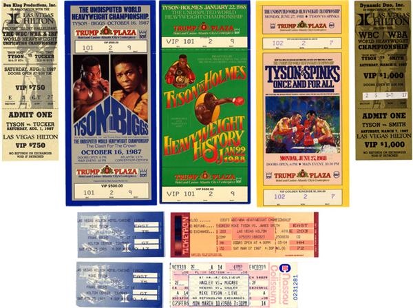 This lot of nine Mike Tyson tickets are from both his title fights and pre-championship fights. Included in this lot are: Tyson-Holmes (EX), Tyson-Spinks (EX), Tyson-Biggs (EX), Tyson-Smith (EX), Tyson-Smith (NRMT-Rare V.I.P.), Tyson-Tucker (NRMT), Tyson-Zouski (EX), and Tyson-Bruno (2) (EX-stub). All these tickets are clean and are on site tickets from the venue. With the exception of the Bruno tickets, all are full tickets.