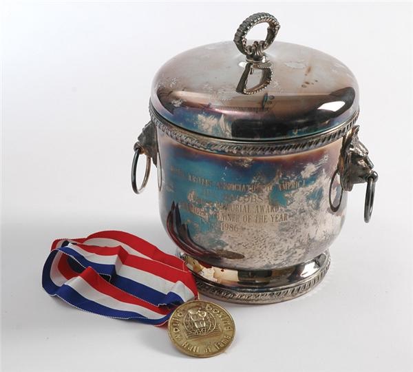 Jimmy Jacobs was the co-manager of Mike Tyson. Along with Bill Cayton he guided the early professional career of Tyson, leading him to the heavyweight championship in 1986 with a win over Trevor Berbick. Jacobs was awarded the prestigious Al Buck Memorial Award by the Boxing Writers Association of America as Manager of the Year for 1986. Presented here is the beautiful silver ice bucket given to Jim Jacobs. This award is 7” high and is inscribed, “BOXING WRITERS ASSOCIATION OF AMERICA JIM JACOBS AL BUCK MEMORIAL AWARD MANAGER-TRAINER OF THE YEAR 1986” In fine condition featuring lion head handles on each side. Cus D’Amato was the trainer who handled the careers of Jose Torres, Floyd Patterson and the early career of Mike Tyson. D’Amato was recognized for his life’s work by the World Boxing Hall of Fame who awarded him the medal offered here. The medal is 2 ?” in diameter and includes the original red, white and blue cloth sash. Here is an opportunity to obtain personal memorabilia of the two guiding lights behind the early career of Mike Tyson. In fine condition.