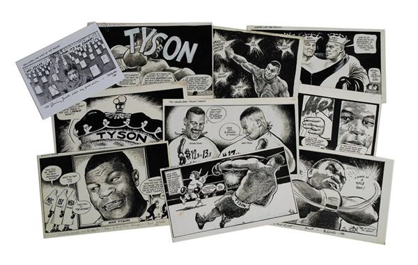 Original cartoon artwork of famed cartoonist Bill Gallo of the New York Daily News comprises the majority of this offering. Gallo has personally signed seven of the original artworks to either Jim Jacobs, Bill Cayton or Mike Tyson. Group also includes a copy of an original Gallo regarding the passing of Joe Louis and a beautiful original cartoon artwork created and signed by Hy Rosen following Tyson's win for his first title. All in Excellent or better condition. Average size is about 11" x 14."