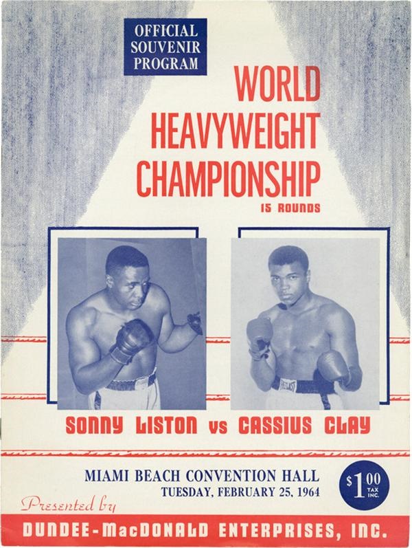 On February 25, 1964 in Miami Beach, Florida, World Heavyweight Champion Sonny Liston defended his title against undefeated upstart challenger Cassius Clay. Clay was a decided underdog going into the fight, but his youth and speed prevailed leading to a 7th round stoppage of Liston in the fight which “shook the world.” Presented here is the official program from this event. The program pictures both fighters on the cover and consists of 12 pages with biographies of both. In fine condition, the program has not been scored, there are no rips or tears and it is not creased. Good tight binding. One of the better examples we have offered.
