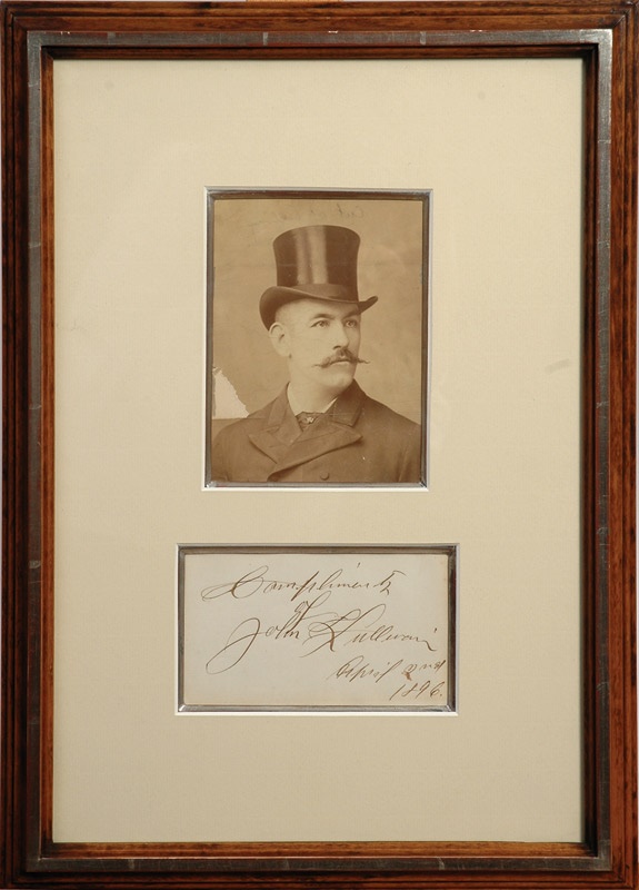 One of the finest signatures we have offered of the great John L. Sullivan is professionally framed with an original photograph of him dating to the early 1880’s. The first-generation photo depicts him in formal attire and top hat. There is a piece missing on the left border which is outside the image. Framed with a large (3 1/2” x 6”) fountain pen signature on paper which is bold and clean. Signed, “Compliments of John L. Sullivan April 2nd 1896.”
