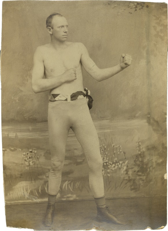 Robert Fitzsimmons (“Ruby Robert”) was a blacksmith, but he found he could fight and began as a professional in 1883. Considered one of the greatest fighters of all time, he stopped some big names: Jack Dempsey, James J. Corbett and George Gardner to name a few. Presented here is a rare original antique photograph of Robert Fitzsimmons taken in the early 1890’s by Richard K. Fox and the Police Gazette. Fitzsimmons is posed in full fight pose, bare fisted with his belt sash and togs. The photograph is mounted on board and measures 11” x 15 ?”. The image is crisp and clear. There is some chipping along the bottom and one spot on the right edge. None affects the image. A magnificent early shot of Fitzsimmons and exceedingly rare, especially in this size.