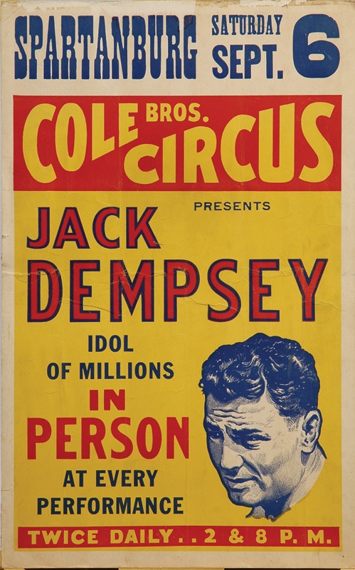 Jack Dempsey, the "Idol Of Millions," is featured in this circa 1930's original circus poster. Dempsey appeared in numerous venues like this while champion and after. This original illustrated poster is paper measuring 13" x 21." It has a few light creases and some minor wear . Some slight fading with a crisp image of Jack Dempsey.