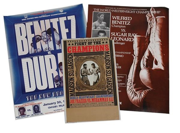 An interesting offering of modern boxing posters and ephemera including some of the major names in the sport over the past fifty years. Includes: 10 Duran-Benitez Mini Posters (VG-EX), Palomino-Benitez (EX), Ali-Frazier I (Closed Circuit-GD), Hall Of Fame 1993 (EX), 2 Holmes-Cooney (EX), 3 Leonard-Benitez (EX), 2 Benitez-Santos (EX), 1 Benitez-Hamsho (EX), 1 Benitez-Hope (EX), 5 Duran-Benitez (Full Size-EX), 2 Chavez-Rosario (EX), 1 Rosario-Randall (EX),1 Rosario-Bramble (EX), 2 McGuigan-Pedrosa (EX), 2 Hearns-Leonard (EX), 3 Holmes-Cooney (EX), and Patterson-Moore (VG-Colorful Cover from Press Kit). All are on site from the venue except the Patterson-Moore and Ali-Frazier I.