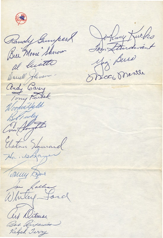 A signed letter from Randy Gumpert. On Yankees letterhead, dated May 14, 1957, the letter reads “Dear Mel, Enclosed are the autographed sheets I promised to get for you and your two buddies. Kindest regards, Sincerely, Randy Gumpert.” Of particular interest are Mantle, Berra, Howard, Ford and Kubek signatures. Twenty one signatures in all, rating 9-10/10. The pages have typical mailing folds. A wonderful display piece.