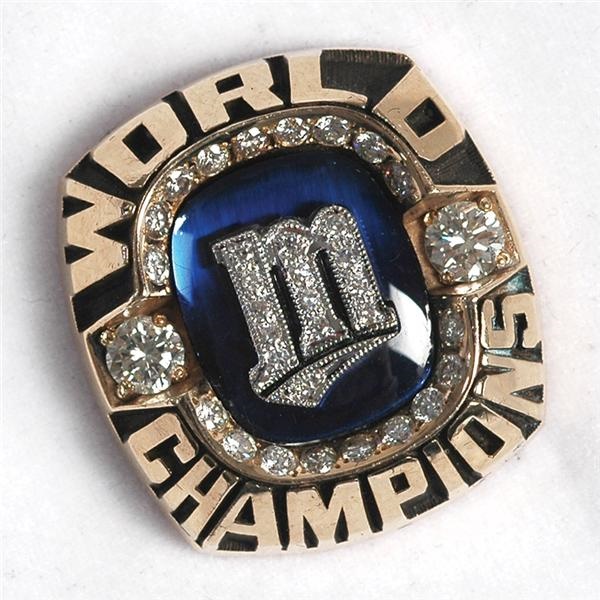 A rare specimen of Minnesota's beloved Twins. This prototype ring top by Balfour is made of real gold but has not been stamped. The face features the Minnesota "M" on a blue stone and surrounded by diamonds, all real. The outset of the face reads "World Champions" with two diamonds separating the words. This wonderful piece from 1987 is in Near Mint condition and foresees their dazzling win over the St. Louis Cardinals that year.