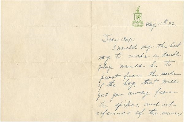 In extremely rare form, a letter from John McGraw discussing how to turn a double play in 1932, his last year as the New York Giants' manager. Signed and written in full by McGraw himself, the legendary "Little Napoleon" has written on the front and back of this piece of stationary from The Drake Hotel in Chicago. The writing and signature are graded 9/10 in black fountain pen ink and the letter itself is in overall EX condition with expected mailing folds.