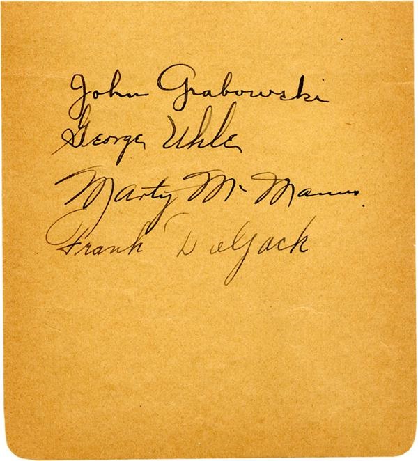 An elusive character, 1920's Yankee John Grabowski has signed this top of an album page along with Cleveland Indians pitcher George Uhle, Browns infielder Marty McManus and Frank Doljack. This is an extremely rare find as Grabowski is one of the toughest signatures of the 1927 Yankees to obtain. The signature is graded 9/10 and the page itself is in EX-MT condition.