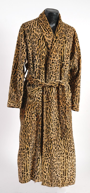Many athletes in professional sports seek out some sort of signature item that will identify them for life. For the great fighter Jake LaMotta, the “Raging Bull,” it was his leopard robe. Used in numerous fights throughout his illustrious career LaMotta was easy to identify as soon as he climbed into the ring. Leland’s is proud to offer the famous leopard style robe used by Jake LaMotta in most of his important fights both before and after he won the World Middleweight Title. The robe is full length, with long sleeves and the original sash, and sports the Everlast label in the collar. There is a tear under one arm. There is some slight discoloration from age. The robe is a crushed velour with the unique leopard design. The robe came from the collection of Jake’s equally famous wife Vikki and comes with a full hand-written LOA from her which is dated Sept. 1997. In this LOA she states that Jake used it during the mid to late 1940’s before it was eventually replaced by a similar robe with a hood. Additional LOA from Craig Hamilton of JO Sports, Inc. A photograph of Jake LaMotta is also included, showing him wearing this robe at one of his fights.