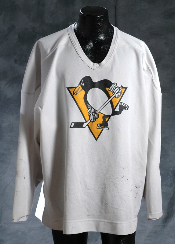 A superb trophy of one of the best hockey players to ever shred ice in the NHL. Mario Lemieux suffered from several crippling medical issues while he played for the Pittsburgh Penguins but still went on to be named MVP three times, lead the league in scoring six times and became a part owner of the Penguins when he saved them from a 1999 bankruptcy. This jersey shows major use from a season of practice, pilled with stick marks and small rips all over. The CCM tag on the right tail is intact but the collar tag is worn down though a small "66" is visible in marker above it. The Penguins crest is screened on the front of the white jersey.