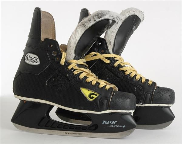 Late 1990's skates worn by Jagr when he was playing with the Pittsburgh Penguins and collecting NHL awards like trading cards.  Nice use on these Graf Supra 705's with scuffs and scratches all over. "Jagr" on a strip of Dymo tape on the bottom of both. A great pair of skates from a hockey legend.