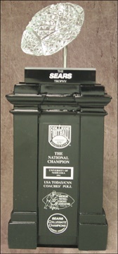 Waterford Crystal trophy known as "The Sears Trophy." For "The National Champion," this was awarded from a vote of the all-important USA Today/CNN Coaches Poll. Brilliant standard is a wood plinth with Waterford Crystal football at the top. Was presented to only members of the team and VIP's. This is the first one we have ever seen. Stands a stunning 14" tall.