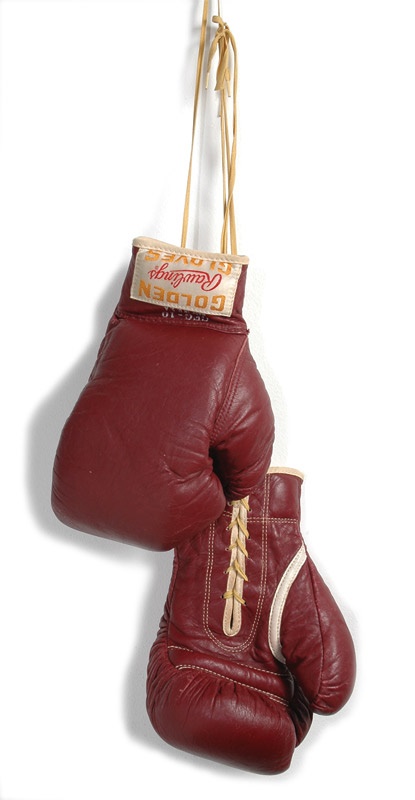 On April 9, 1960, Cassius Clay at the age of eighteen successfully defended his National A.A.U. title deftly beating Jeff Davis in the second round. The trophy won by Cassius Clay and the gloves he wore in the finals were presented to his trainer Joe Martin and displayed at his Columbia Street Gym in Louisville, Kentucky before the gym closed in the mid 1960’s. Offered here are the gloves used by Cassius Clay in the 1960 National A.A.U. finals. The gloves are burgundy leather with white manufacturer’s label at each wrist for RAWLINGS. “Golden Gloves” is also present on the label. These are 10-ounce gloves as is indicated on AAU label inside the right glove. Each glove is stamped inside by the commission, “NAT’L A.A.U. TOLEDO 1960 APPROVED.” The gloves are initialed by the inspectors. The gloves show moderate wear and include the original laces. LOA from long time Ali collector Peter Morkovin who originally purchased the gloves. Additional LOA from Craig Hamilton of JO Sports, Inc. Newspaper article from the Louisville Courier gives the results of the fight. These represent the earliest, documented fight worn gloves of Cassius Clay to come to auction. A perfect companion to the trophy also being offered in this sale.