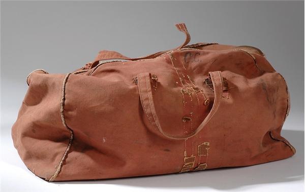 Cassius Clay's amateur gym bag which he used while training at the Columbia Street Gym in Louisville. This well worn bag has the initials C.C. written in ink on the outside. One strap is torn, but the bag is complete. A rare offering from the teenage years of Cassius Clay. LOA from long time Ali collector Peter Morkovin who purchased this item originally. Additional LOA from Craig Hamilton of JO Sports, Inc.