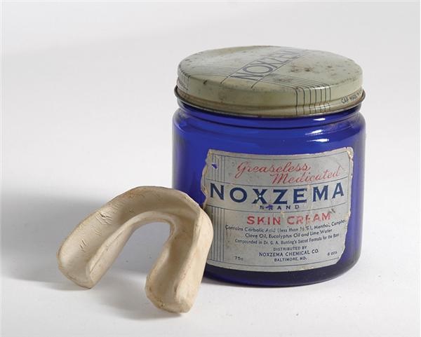 Cassius Clay's amateur mouthpiece which he used while training in Louisville with Joe Martin. It was kept in an old Noxema jar which is included with this lot. The mouthpiece dates to Clay's amateur career and was likely used during training sessions in the gym and during actual amateur fights. A rare offering from the teenage years of Cassius Clay. A fabulous offering straight from one of the most famous mouths of all time, "The Louisville Lip." LOA from long time Ali collector Peter Morkovin who purchased this item originally. Additional LOA from Craig Hamilton of JO Sports, Inc.
