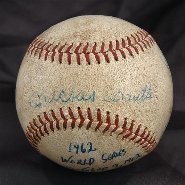 One of the great rivalries and friendships in baseball history is captured in this vintage baseball from the 1962 World Series. Game-used and inscribed "1962 World Series, October 9th, 1962" in blue pen, this Official American League Joe Cronin ball was signed by both Mickey Mantle and Roger Maris in blue ink and is toned by game use. Maris' signature appears on the side panel while Mantle's appears on the sweet spot, both signatures rate 7/10.
