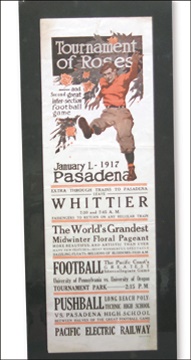 Artful and wonderfully preserved (EX) poster encourages gridiron fans to take a train to Pasadena for the New Year's Day battle between the University of Pennsylvania and the University of Oregon. One of the most exciting college football pieces we have offered.