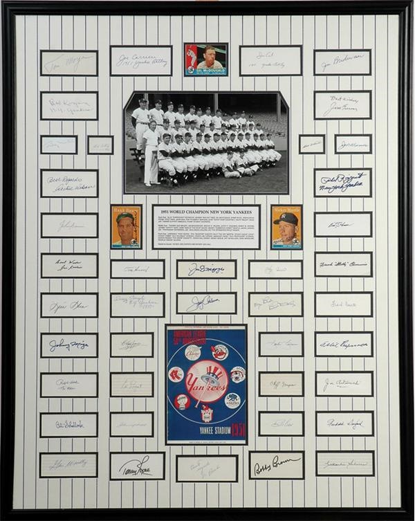 The sole year of DiMaggio and Mantle. This 1951 NY Yankees World Series Champions framed collage contains a signed 1959 Mickey Mantle Topps Card, signed 1959 Hank Bauer, a 1951 game program, and 45 total signatures including New York Yankees legends Joe DiMaggio, Phil Rizzuto, Yogi Berra, Billy Martin and Casey Stengel. Most of the signatures appear to be on 3x5 cards. The beautifully displayed frame is excellent and the interior has that final Yankees touch, a pinstripe mat!