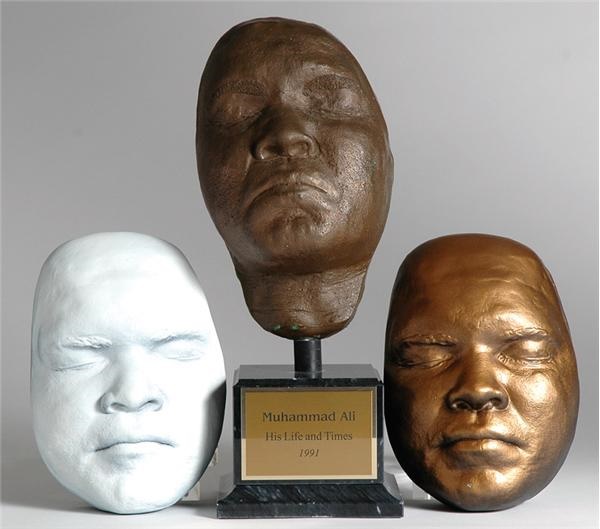 Muhammad Ali's face is immediately recognizable by fans all over the world. The famed pugilist's countenance is no less recognizable in these four life castings. Made for a fundraising effort, the face masks were only available in a limited quantity. The most eye catching of the lot has illustrations by renowned folk artist Howard Finster drawn onto the white casting. It is signed and dated on the back. One mask has a bronze finish and is mounted on a base for display. One has a sprayed on bronze patina and another is sprayed white with an eerie effect. Both have a hook on the back for hanging. Overall they are EX-MT to NRMT.