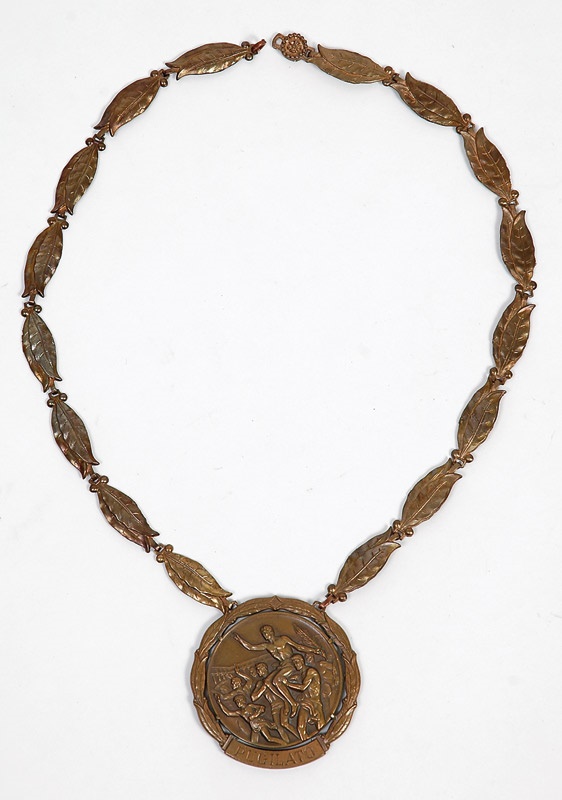 There are only a handful given out every four years, and Cassius Clay, a.k.a. Muhammad Ali, weighed the gold version around his neck during those 1960 Rome Olympics, while the silver went to Zbigniew Pietrzykowski of Poland, and it is believed, as this olive leaf-chained award was originally purchased in Italy, that this bronze medal belonged to the third-place champion of the light heavyweight division, Giulio Saraudi. All original, this glorious disc has “Pugilato” engraved in its bronze surface. Important not only as an Olympic medal but also as a boxing artifact. Comes with original chain.