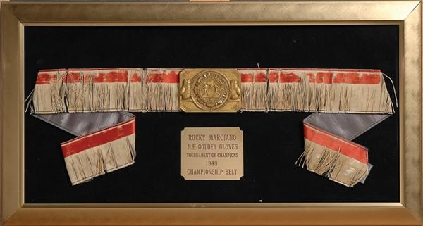 Rocky Marciano was the only man in the history of boxing to retire as Heavyweight Champion with a perfect professional record (49-0). Of course his amateur career wasn't too bad either. Presented here is the actual championship belt given to Rocky Marciano for his victory as an amateur in the Golden Gloves in Lowell, Massachusetts. The belt still has its original white and red sash which, although frayed, is perfectly intact. The center buckle states, "N.E. Golden Gloves Tournament Of Champions Lowell Sun Charities" and in each corner of the buckle are the words, "WGT HVY 19 48." Only one man could have won this belt: Rocky Marciano. Framed with a plaque which reads, "Rocky Marciano N.E. Golden Gloves Tournament Of Champions 1948 Championship Belt." The belt is approximately 35 inches long. The belt comes with an LOA from the brother of Rocky Marciano. One of the most historic and important items of memorabilia to be offered at public sale of this great champion. Additional LOA from Craig Hamilton/ JO Sports.