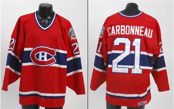 Red, white and blue jersey of center Guy Carbonneau, as he skated for the 1989 Wales Conference champion Montreal Canadiens. Never one to back down, he eventually became the team Captain, book-ended his career with the Habs winning a Cup in ’86 and ’93, and presently is their 28th head coach. Jersey distinguished by cut on left elbow and stick mark just above that, a slice on the classic Canadiens logo on front, and pilling inside sleeves. Maska Ultrafil tag in collar, and Stanley Cup patch on left shoulder.