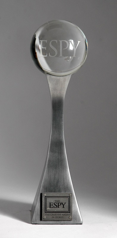 This is the first Espy Award we have seen on the market. This trophy was part of a traveling display for ESPN. The weighty award is a brushed aluminum column crowned by a crystal orb with "ESPY" etched into the face. The base has a plaque that reads "The ESPY...The Greatest Night in Sports" It stands 17" tall and is an amazing award piece worthy of your trophy case.