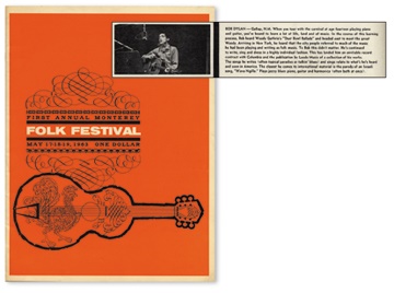 This 1963 concert program for the 1st Monterey Folk Festival on May 17th - 19th, was Bob Dylan's west coast debut performance alongside folk, blues, and gospel artists, Peter, Paul & Mary, The Weavers, Mance Lipscomb, The New Lost City Ramblers, and many more. Program features words and music to a number of old-timey folk and bluegrass songs, along with bios of each artist, and ads. EX.