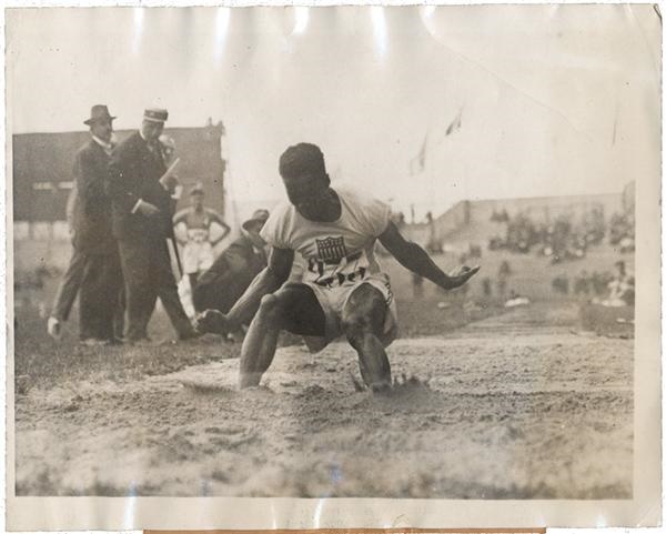 Early images (1920s) of De Hart Hubbard, the first African American to win a gold medal at the Olympics (at the 1924 Paris Games). Includes set of five from 1926 meet including nice posed portraits, pair of 1925 oversized in action shots, shattering two world records at Stagg Field (1925), and two pivotal 1924 Olympic winner's photo and making his winning jumps both with original paper captions (gorgeous). Overall EX+ and 7x9".