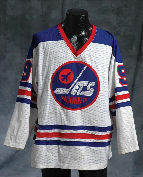 Bobby Hull fanatics rejoice! This great jersey, dating from his 1974-75 season, is from his days with the Winnipeg Jets and came directly from Hull's son some years ago. The jersey is game-worn and shows some great battle scars ranging from stick marks near the hem at the bottom of the jersey to small stains with some inside pilling as well. The use is light but definite on the inside and out. Jets crest on front is hand-embroidered and sewn on along with the "9" that appears on the back and both sleeves as well. "HULL" is screened on nameplate and sewn on the back. The collar features a HARV-AL tag and a size large ("L") tag. There is a shoelace-style fight strap on the inside. The jersey is white with blue and red dressings. The use is light but definite on the inside and out.