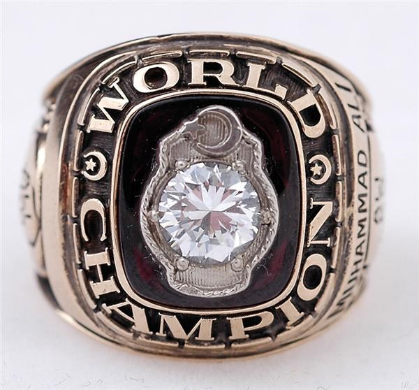This beautiful 10k gold ring is an all original sample just like the one awarded to the Champ for knocking out Foreman in “the Rumble in the Jungle.” A faux diamond with a star & crescent graphic above it is set into a red stone on the face. Surrounding the stone it reads “World Champion” with two more of the star & crescent icons between the words. On one shank it reads “Muhammad Ali” above a shield that reads “ALI KO FOREMAN 8” flanked by wreathes and “1974” below it. The other shank reads “ALI TKO LISTON 6” on a glove above “1964” The Jostens stamp is on the inside of the band. The ring is a size 10.5