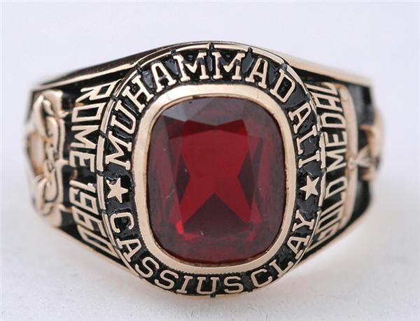 The Muhammad Ali mythology begins here, with the young Cassius Clay in Rome. After rising above the blue grass of Kentucky the Amateur champ was ready for the greatest test of all - the Olympic Games. On the Italian soil, wise-cracking Clay won the Gold in the Light Heavyweight division. Upon his return to America, Clay turned pro and the rest as they say is history. 10-karat gold ring is stamped on inside, "Rome 1960," with the "IGO" makers mark as well. Left shank has “Gold Medal” in raised text and image of hanging gloves, while right shank has raised text that reads “Rome 1960,” and two Olympic torches. Red stone on top, with “Muhammad Ali - Cassius Clay” surrounding that in raised text. This gorgeous ring was made at a later date and did not belong to Clay. NRMT.