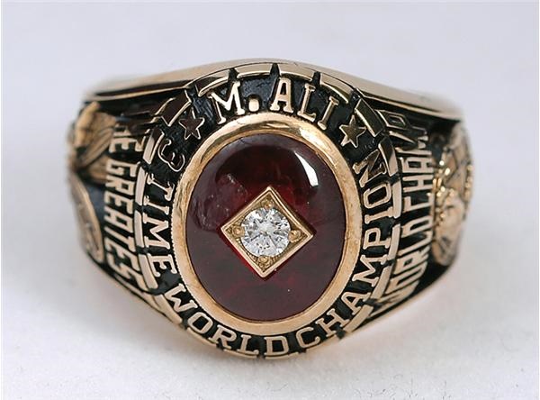 A great gold ring from “The Greatest” This 10k gold ring was made in limited quality and although it wasn’t his, it is like the one given to him to celebrate his reign as three time World Champion. A faux diamond is set into a red stone on the face with “M. Ali 3 Time World Champion” written around it. On one shank is a picture of a bee with “The Greatest” written above it. On the other shank is “World Champ” written above a globe. “IGO” makers mark is on the interior side of the band. This size 12 ring is NRMT.