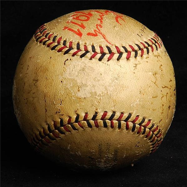 Official National League red and black stitched baseball with written and signed names of members of the 1911 Phillies. The signature of Alexander is very light and rates a "1-2" on scale of 1-10. Also legible is the signature of Red Dooin. All writing is very light. Painted on a panel is "T.J Lynch 1911."