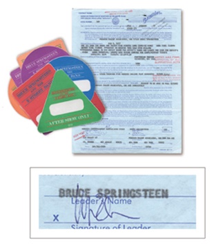 This standard American Federation of Musicians 1977 contract for Bruce and his E Streeters appearance in Rochester, NY is signed by Premier Talent Associates promoter, John Scher. From the "Born In The USA" Summer, 1985 tour we have eight backstage and working personnel passes, as well as a copy of a twenty-four page rider outlining every conceivable detail imaginable. You'll be thrilled to be privy to the fact that Clarence required two whole cornish game hens "immediately" after every show that were to be "broiled or baked, NEVER fried!!!".