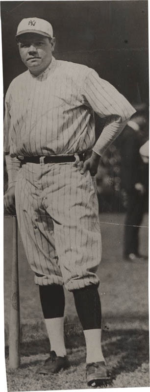 Great image of the young Yankee slugger in his pinstriped uniform with his favorite weapon, a baseball bat. This Ruthian image has been trimmed to measure 3.5 x 9 and is EX+ in condition, clarity and contast.