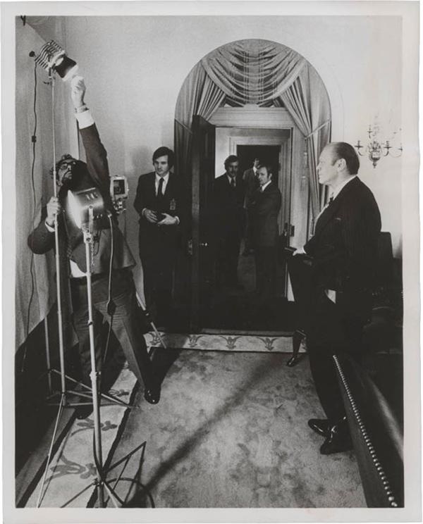 Interesting behind the scenes glimpse of President Ford, in the Oval Office, patiently waiting for his presidential portrait. Image measures 8 x 10 and is NM in condition, clarity and contrast.