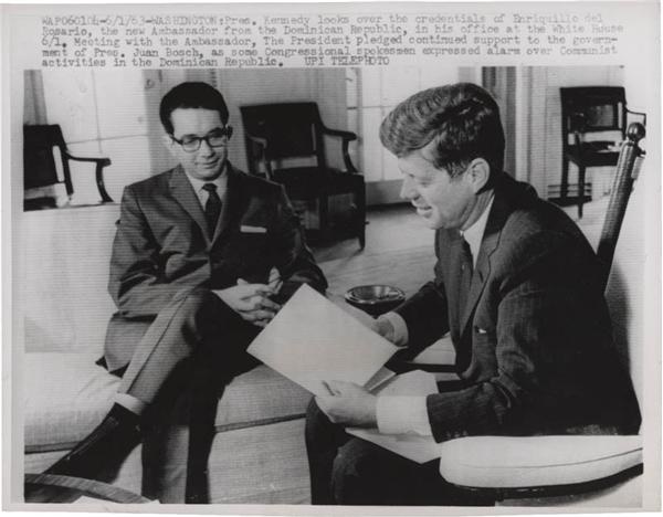 Nice selection of JFK images showing the charismatic American President in the everyday chores of his Office-greeting diplomats, heads of state and the press. These images from Camelot average 8 x 10 and are NM in condition, clarity and contrast.