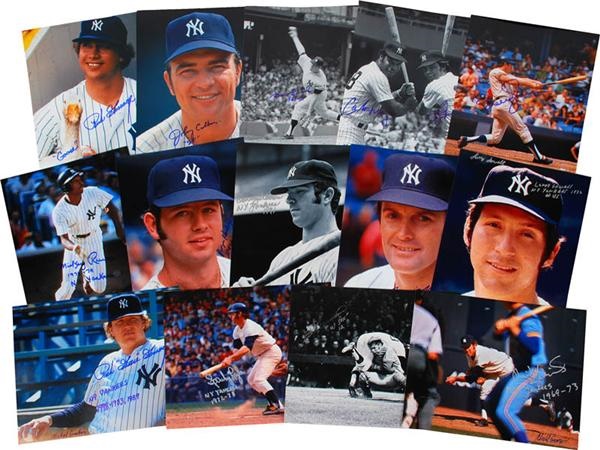 32 photos all taken by the official Yankee photographer at the time, Michael Grossbardt. All are signed by the player and Grossbardt. Includes Gossage, Callison, Pinella, Cox, Robero Alomar (taken as a child wearing a Yankee uniform, pretty cool!), Lyle, Lyle/Cater, Kekich, Murcer, Tippy Martinez, May/Pinella, Clarke, Rivers, Walton, Allen, Dent, Gibbs and more. There are multiples of several of the players. They also have the photographers seal denoting that they are from the original negative. All from the late 1960's to mid 1970's. Some very obscure and hard to get names. The photographs them self are top quality. All are 8x10" with color and black and white.