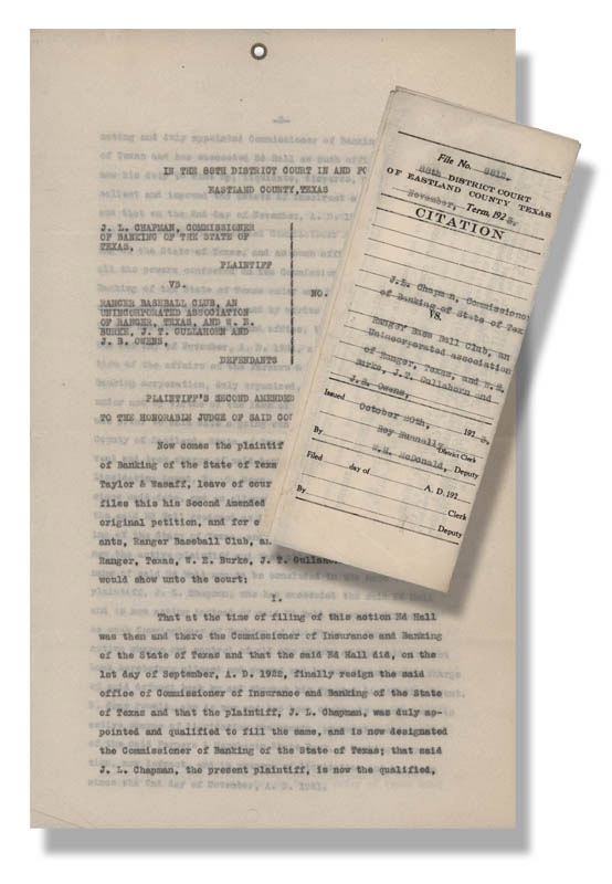 88th District Court Eastland County Texas legal document against the Ranger Baseball Club of Texas. Interesting pieces of minor league baseball ephemera. VG-EX.