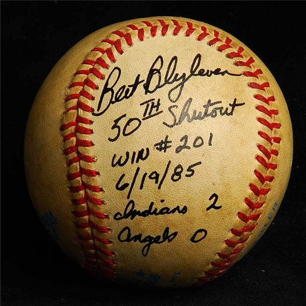 Official American League (Brown) ball was used in the game that Blylevenrecorded his 50th shutout and 201 career victory. Signed and notated by Blyleven. The date of the game was 6/19/85. Signature is 10/10 while ball shows good game use.
