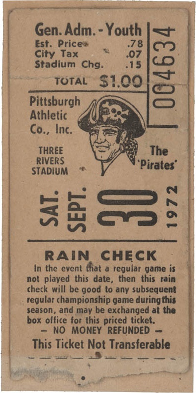 Super rare ticket stub for Pirates home game on Sept. 30, 1972. Clemente got his last regular season hit (his 3,000th) in this game. This was also his last ever regular season game. VG and pasted to a piece of paper from a scrapbook.