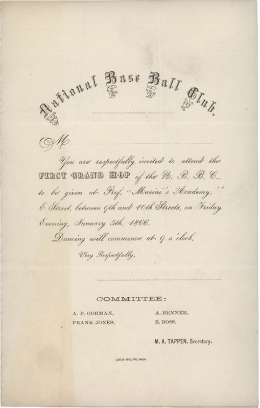 Very early piece of baseball memorabilia is an invitation to the First Grand Hop held by The Washington National Base Ball Club . VG-EX with mailing folds. Space for name is blank.