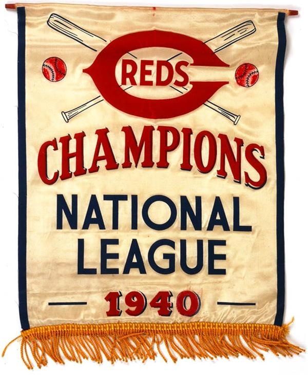 Very rare silk banner with gold tassels at the bottom. All silk screened lettering and design. The two baseballs at the top have even been hand colored red. VG-EX.