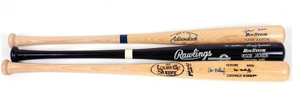 One lot of three full size bats, each individually signed. Includes Reggie Jackson (Mr. October Inscription, #204/563), Don Mattingly and Hank Aaron. All are signed in sharpie. Mint.