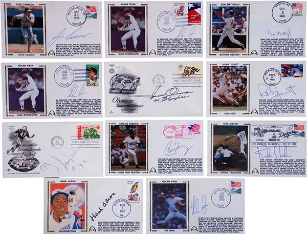 Nine are Gateway Cachets including Jose Canseco, Don Mattingly, Hank Aaron, Robin Yount, Kirk Gibson, Carlos Baerga and Nolan Ryan (3 different). Also includes covers signed by Jesse Owens and OJ Simpson. Mint.