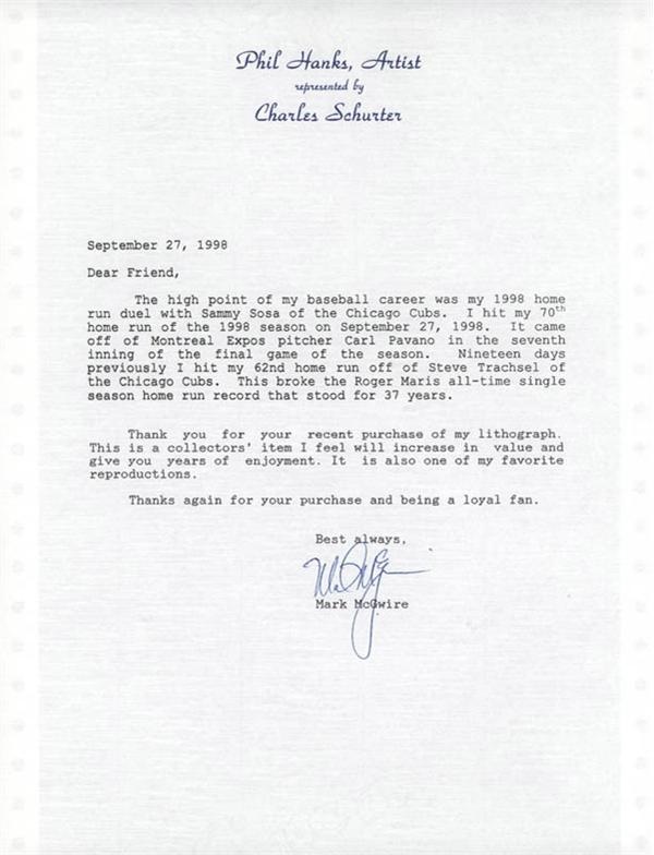 Lot # 191: Mark McGwire 70th Home Run Signed Typed Letter