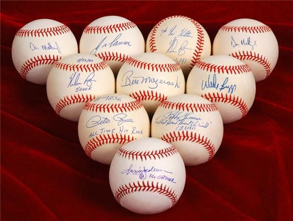 All are Official League Baseballs. Includes Bobby Thomson (Shot Heard Round the World Inscription), Reggie Jackson (in presentation box from Jackson), Pete Rose (All Time Hit King inscription), Don Mattingly (2), Nolan Ryan (7th No-Hitter Inscription), Canseco, Bill Mazeroski / Bobby Thomson, Nolan Ryan with 5000K Inscription and Wade Boggs. NM-MT.