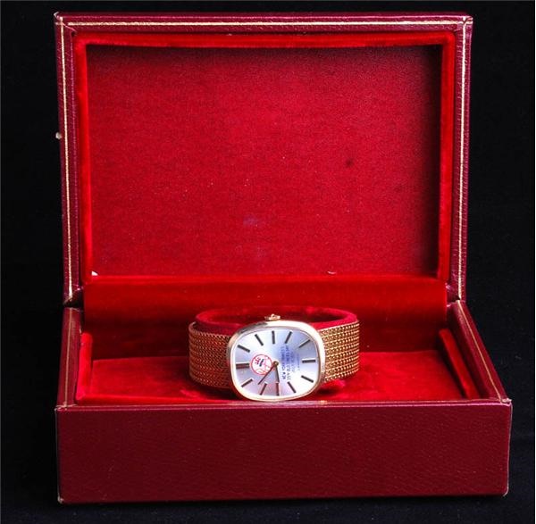 Longines watch with New York Yankees logo on the face and "New York Yankees 25th Old Timers Day July 10, 1971." Engraved with Earle Combs name on the back. Mint, never used and housed in the original box.